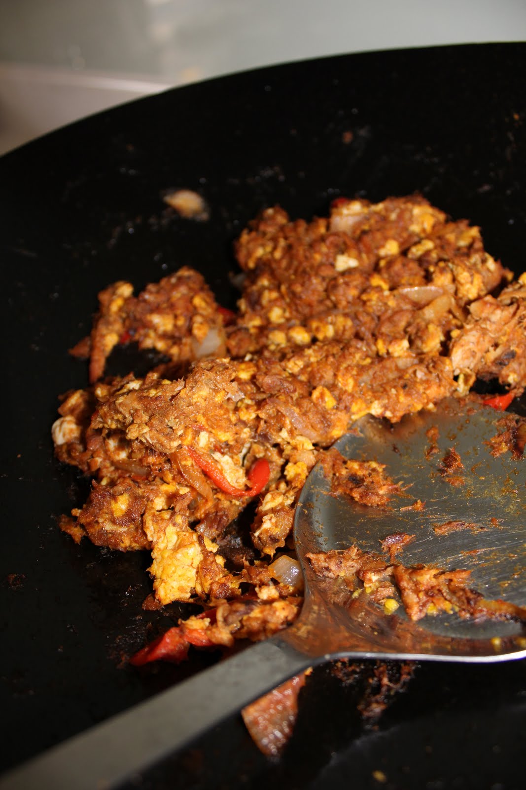 Sardine goreng kari: Mashed canned sardines, scrambled eggs, with curry powder (about 4 tbsp?), and 1 tbsp chilli sauce. Best eaten with bread or piping hot rice!