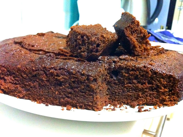 The downside of baking when you're fasting (yes! I made it! 1 day down, 28 more to go!) is you can't get to scrape off the leftover batter in the bowl! But it smells and looks soooo good! While it was baking, omg the smell is AWESOME can! A mix of coffee and chocolate. For a good 45 minutes! I love the aroma of baking. Simply entices you more! And when that was done, I took it out, and my cake had a weird circle popping out on the surface! And it's only the thin layer crust. Weird.