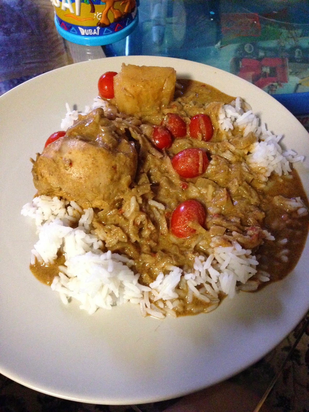 Thinly slice the onions, pound garlic and ginger together. Fry the sliced onions in oil. Add in the cloves, cardamom and star anise to fry together. Once the onions have become soft and fragrant, fry in the garlic and ginger paste. Fry in the chili paste until cooked. Add in the korma powder and curry powder and add a bit of water so that it won't dry out. Add in the chicken and potatoes and fry for about 5 minutes, add water to let the chicken and potatoes cook (about half hour?). Finally, add in the coconut milk on low heat and stir constantly to prevent the coconut milk from "breaking", and add in the cherry tomatoes.