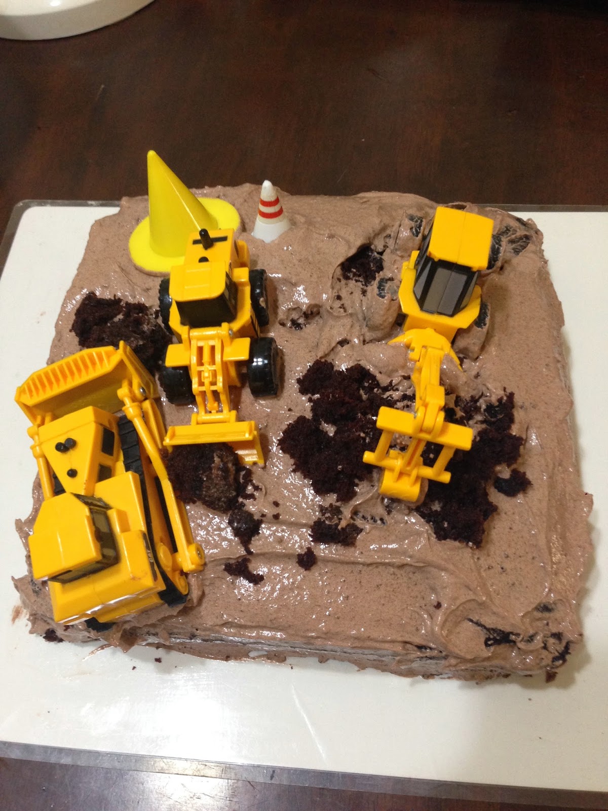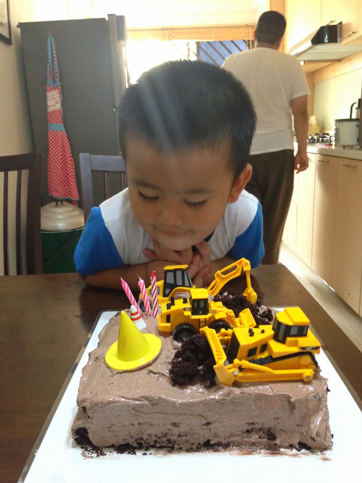 Junior was very excited to make his own birthday cake ever since I showed him that I plan to make a digger cake for his birthday. Just normal chocolate cake, with chocolate frosting and topping it with his diggers and cake crumbs to look like a construction site. Whoever came up with this idea is brilliant! I don't have to frost properly, and he gets to play with the cake first before we cut it.