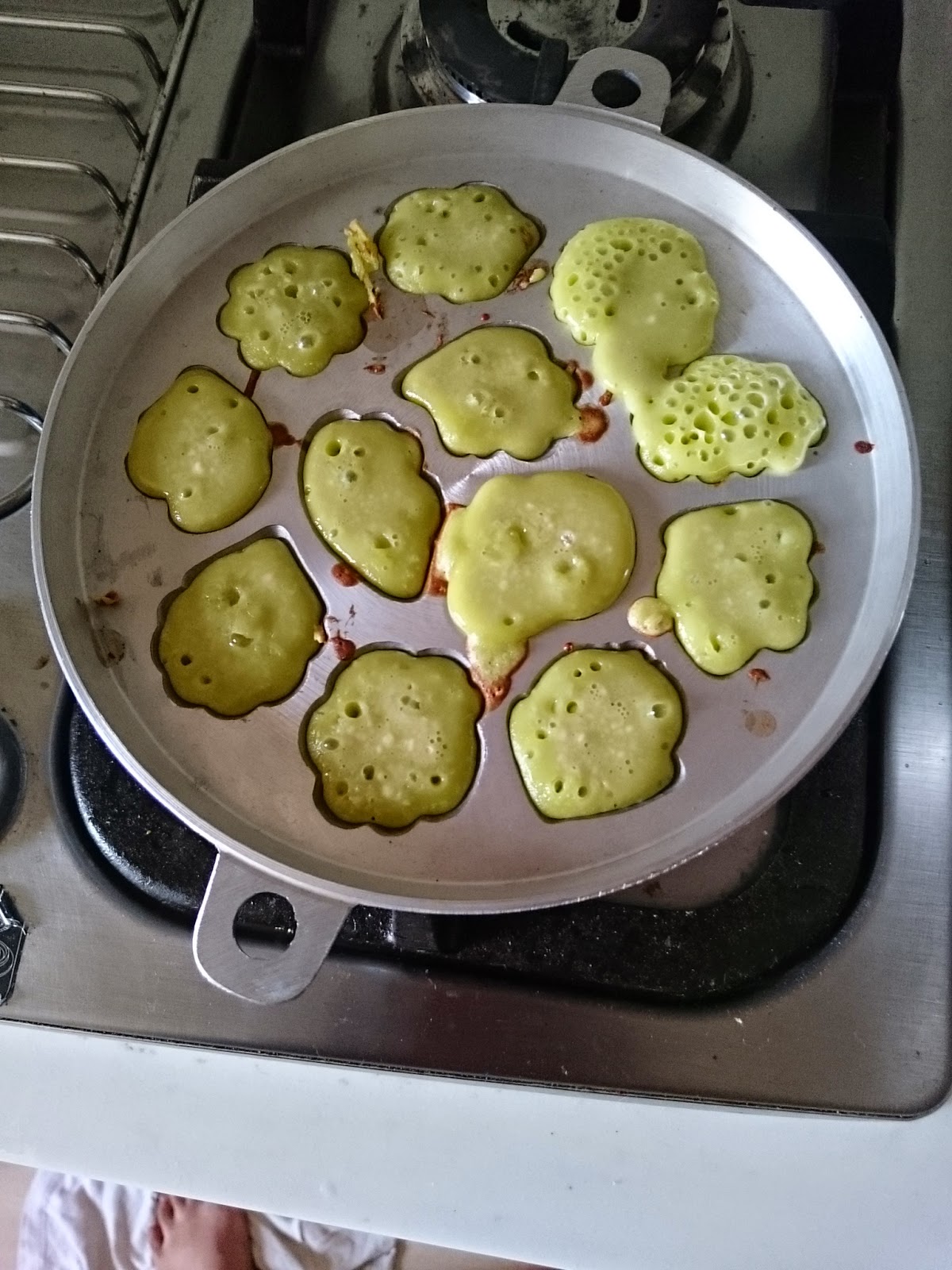 I finally did kuih bakar pandan! I bought the mould ages ago and after making home made pandan extract I finally did it. Haha. I tried both cooking on the pan on top of the stove and by oven, and the stove version is much better. Anyway I kinda overcooked the one in the oven and it stuck to the pan.