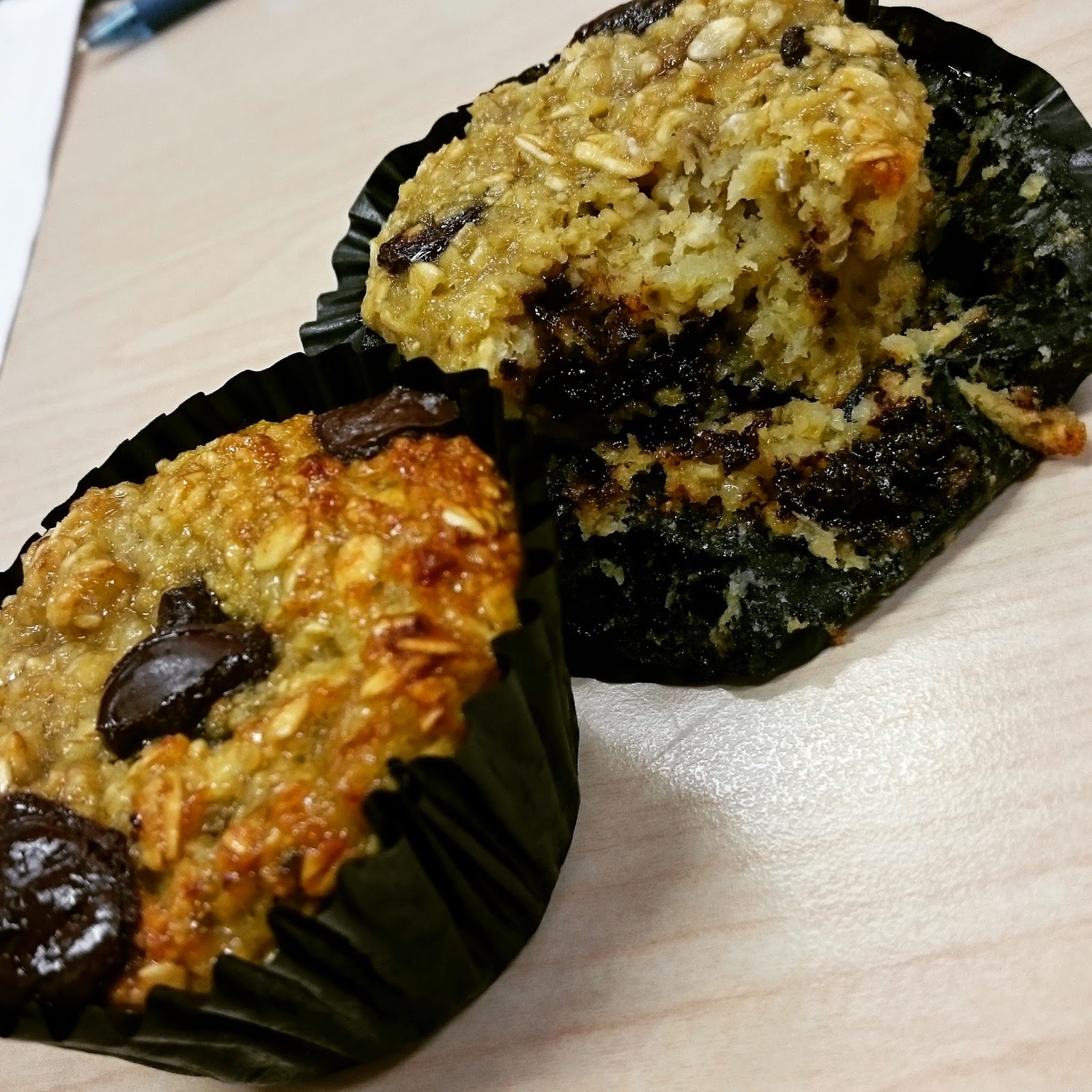 It's amazing, no oil! They turned out moist, but because I didn't process the oats to be really fine, it kinda tasted like eating cooked oatmeal. But still good cos it has a bite and even the Husband said it's okay. I added chocolate covertures for good measure ;)