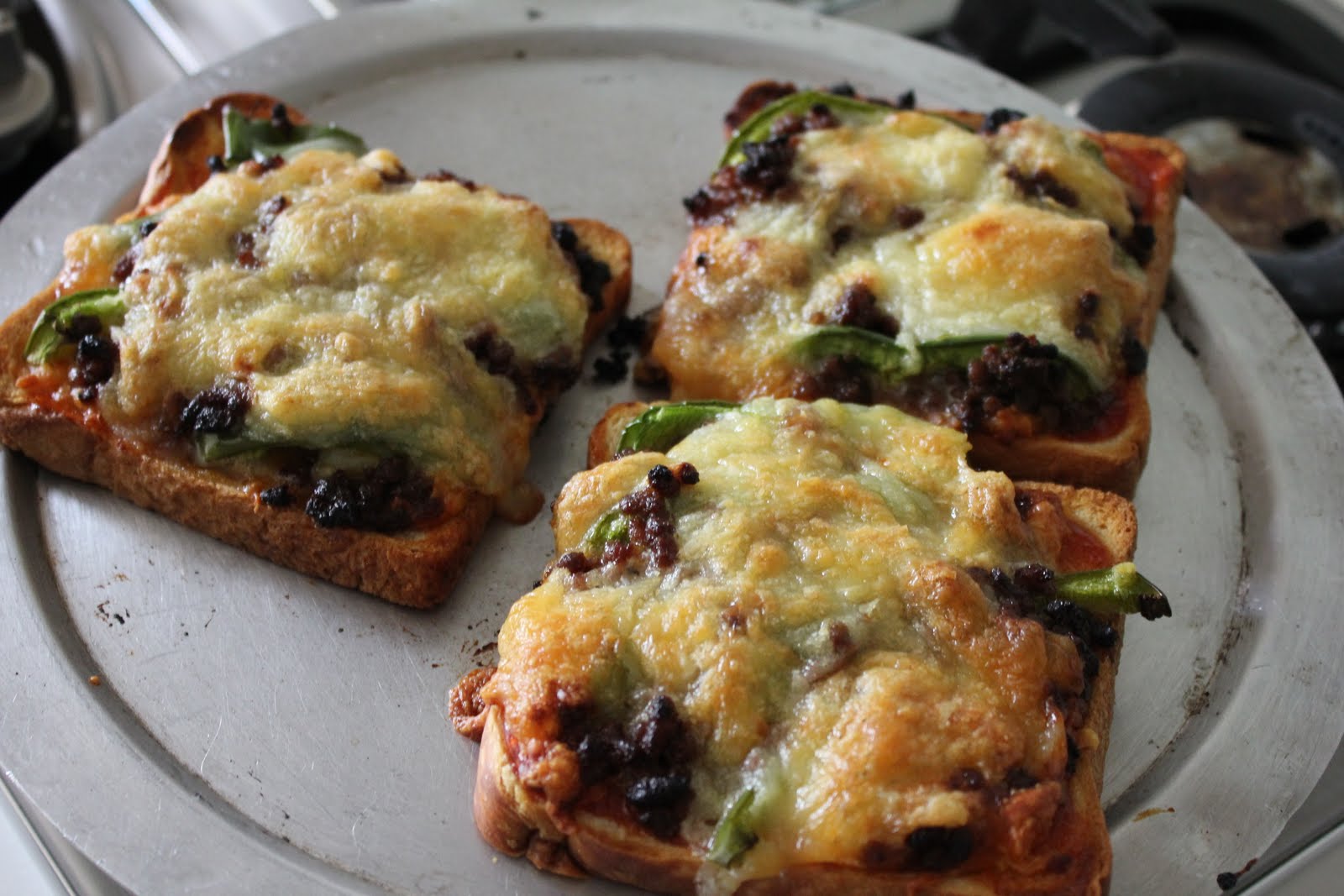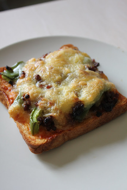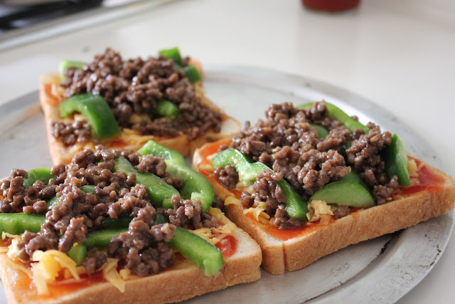 Home alone lunch before check up! Decided to make mini pizzas because I have leftover capsicum and bread. This time round I added a little sauce to the minced meat. Simple but yummy! The minced meat is sweet and tasty!