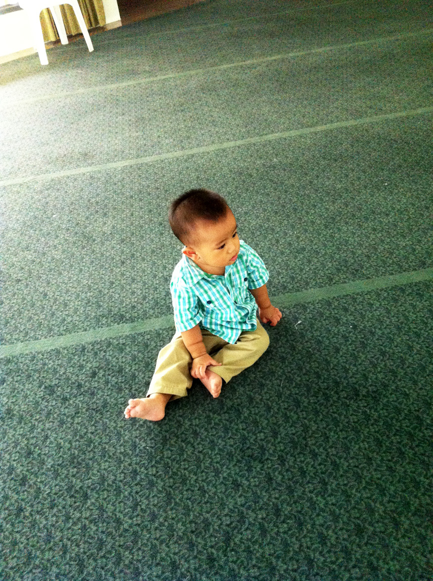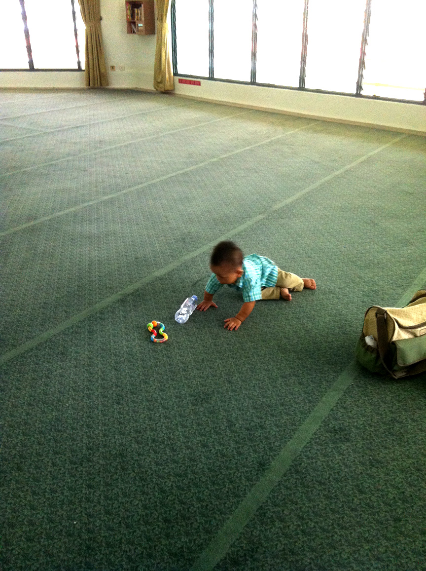We went to a wedding, and surprisingly Junior fell asleep in my arms without nursing! He must be really sleepy. Husband had a meeting after that, so we spent our time at the mosque nearby while waiting for two and a half hours. It was a great place to just hang around, cos it was kinda empty and open, perfect for Junior to practise crawling! Which he did, of course :) And he was friendly to the other ladies at the mosque too! Haha