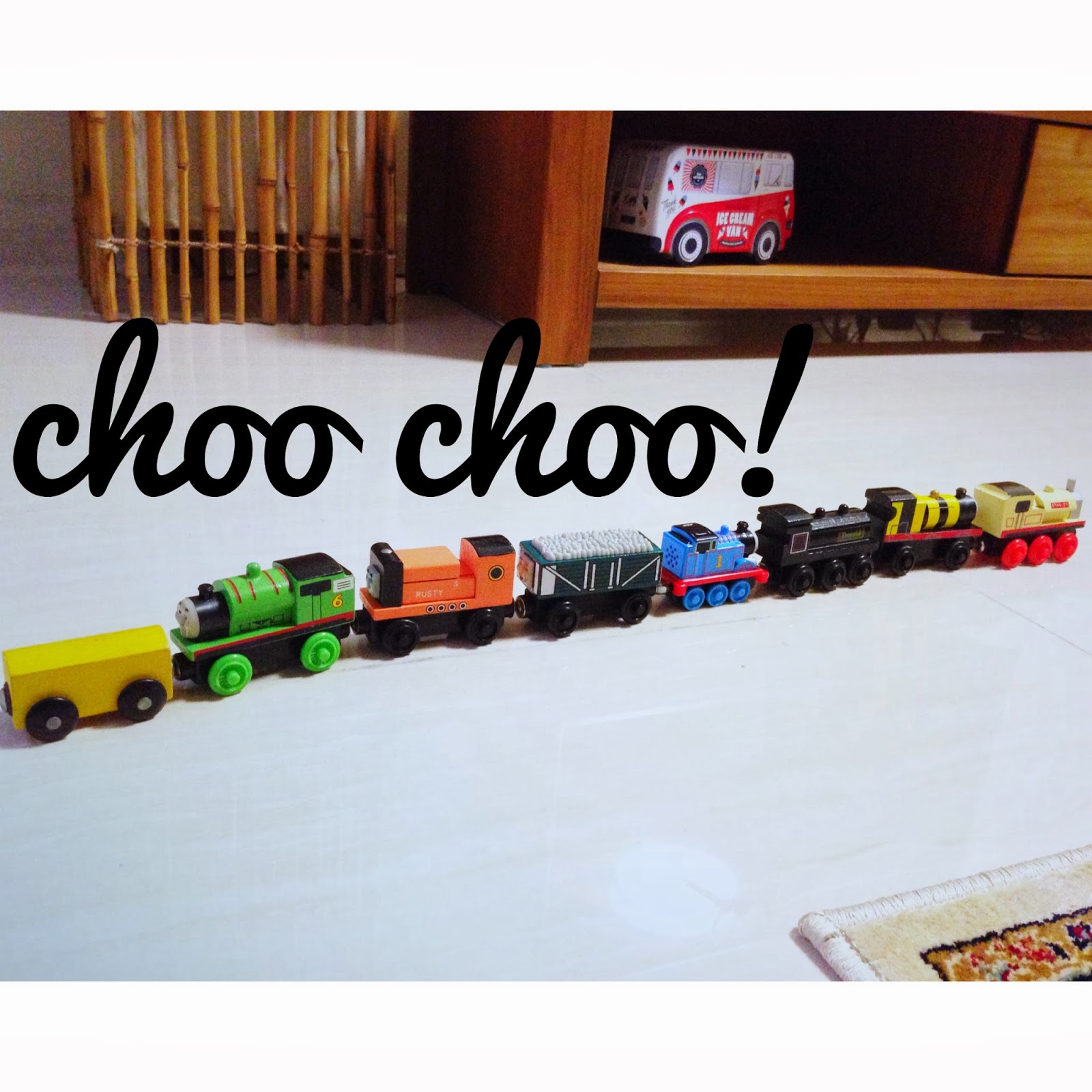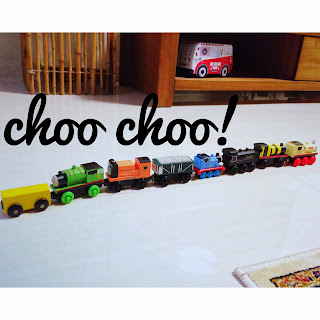 This is his current train collection! We found imitation Thomas the train collection at a push cart in IMM, and they can fit on Ikea's train track set! BRILLIANT! Cheap ($2.50 each only!) and functional! So now he has 6 of those imitation trains (I bought all designs that they sold), 1 real Thomas the train (the blue one) and 1 Ikea train (the rest have gone missing). Now I'm teaching him how to take care of his toys and how to keep them.