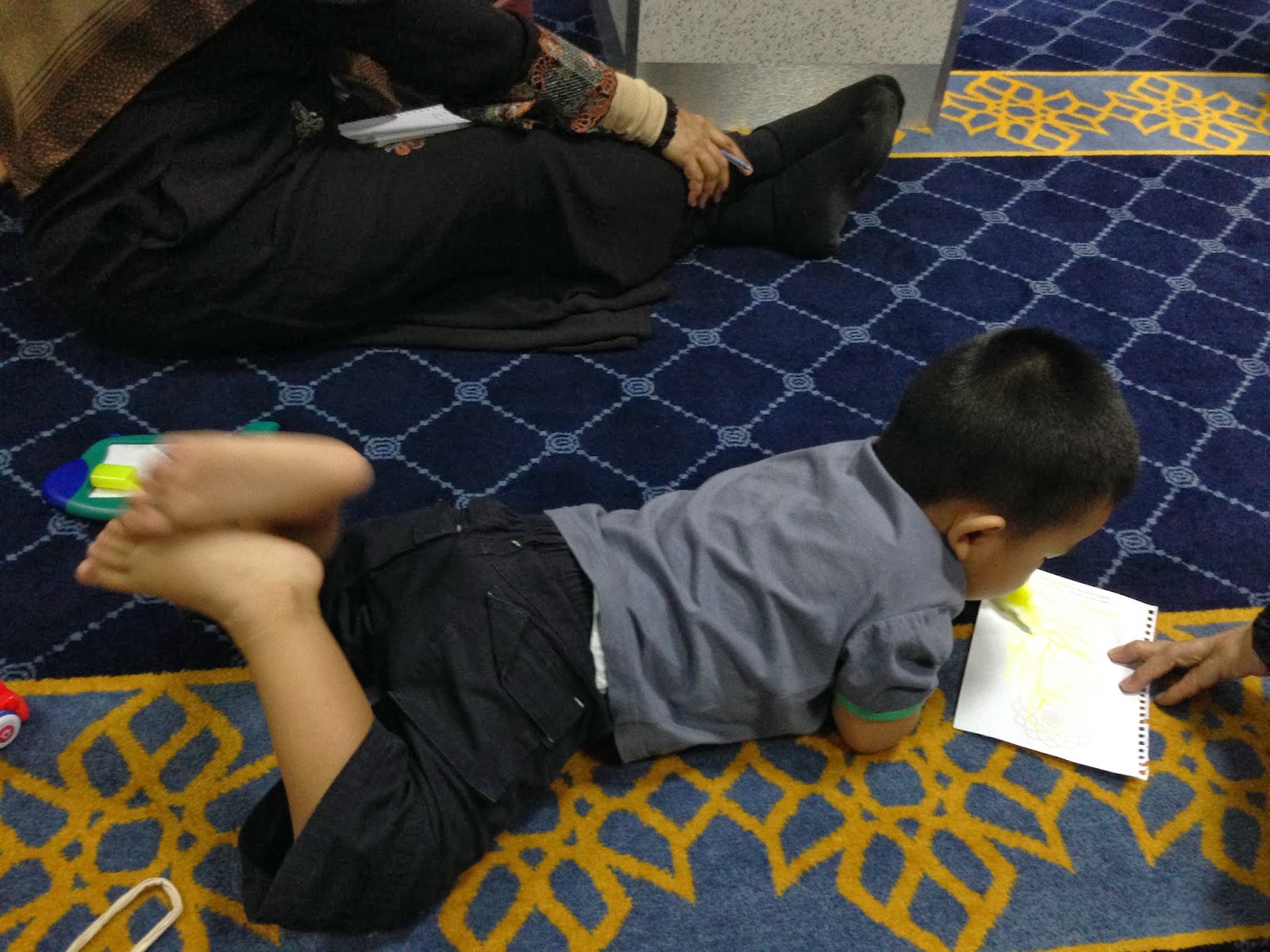 Umar at Ar-Raudhah Mosque, entertained by 2 neneks while syarahan was on going. He is a happy boy at the mosque, and I'm so happy to see him so comfortable at the mosque. Sometimes I meet nice ladies who encourage bringing kids to the mosque, sometimes I get discriminatory remarks like I can't be in the middle Jemaah, that I have to be at the back or at the side so that my son won't disrupt the prayers. Come on lah, my son sits quietly with me. Stop discouraging kids from being accustomed to prayers and to the mosque.